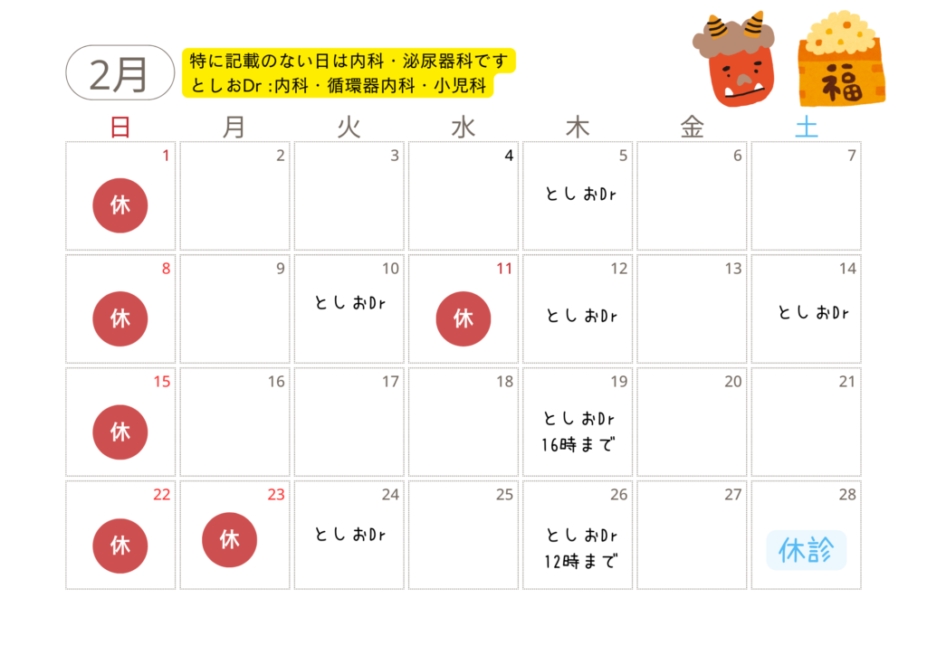- ○印:毎週木曜日、隔週火曜日は中西としお(循環器内科・小児科)が診察を行います。