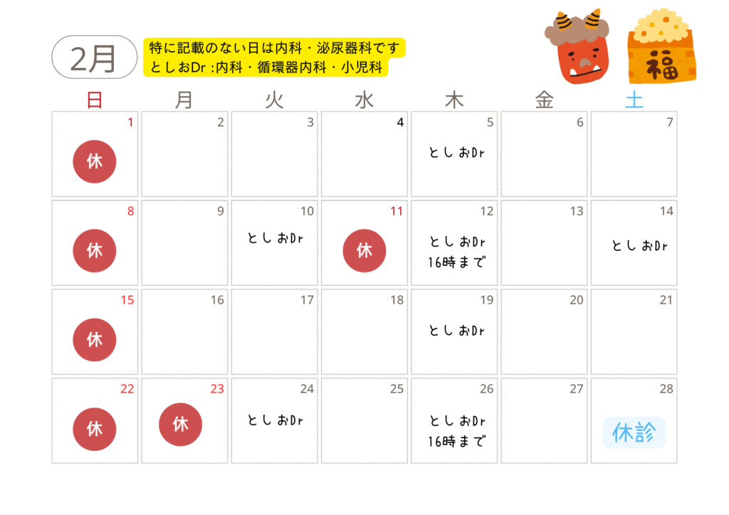 2月の予定表 2026 1/19 お知らせ まだまだ寒い日が続いております。インフルエンザなどの感染症や、寒暖差による体調不良に注意が必要な時期です。気になる症状があれば、お気軽にご相談ください。今月も皆様の健康をサポートしてまいります。 お知らせ よかったらシェアしてね! URLをコピーしました! URLをコピーしました! 2026年1月の予定表 この記事を書いた人 若松河田クリニック 新宿区の泌尿器科、内科クリニック 若松河田クリニック 関連記事 2026年1月の予定表 2025年12月10日 オンライン医療事前相談を開始しました。 2025年12月1日 12月、年末年始の予定 2025年11月18日 インフルエンザワクチン 2025年10月10日 11月の予定表 2025年10月9日 10月の予定表 2025年9月16日 【院長ブログ】クリニックに舞い込んだ小さなお客様 2025年6月14日 エナルモンデポ入荷しました 2025年5月22日 コメント コメントする コメントをキャンセルコメント ※ 名前 ※ メール ※ サイト 次回のコメントで使用するためブラウザーに自分の名前、メールアドレス、サイトを保存する。